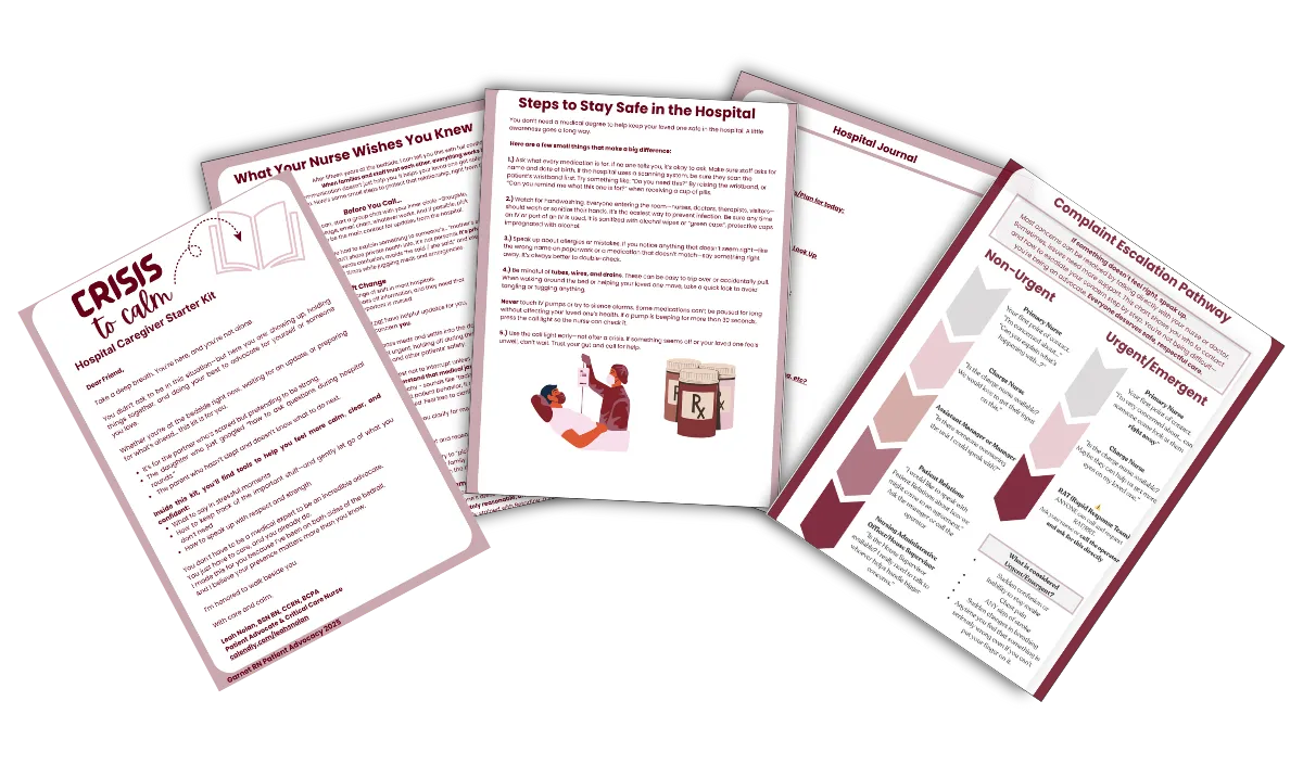 The Crisis to Calm Hospital Navigation Kit gives you scripts, safety tools, and fast answers so you can speak up, protect your loved one, and make confident decisions in the moments that matter most—even if you’ve never dealt with doctors or hospital staff before.